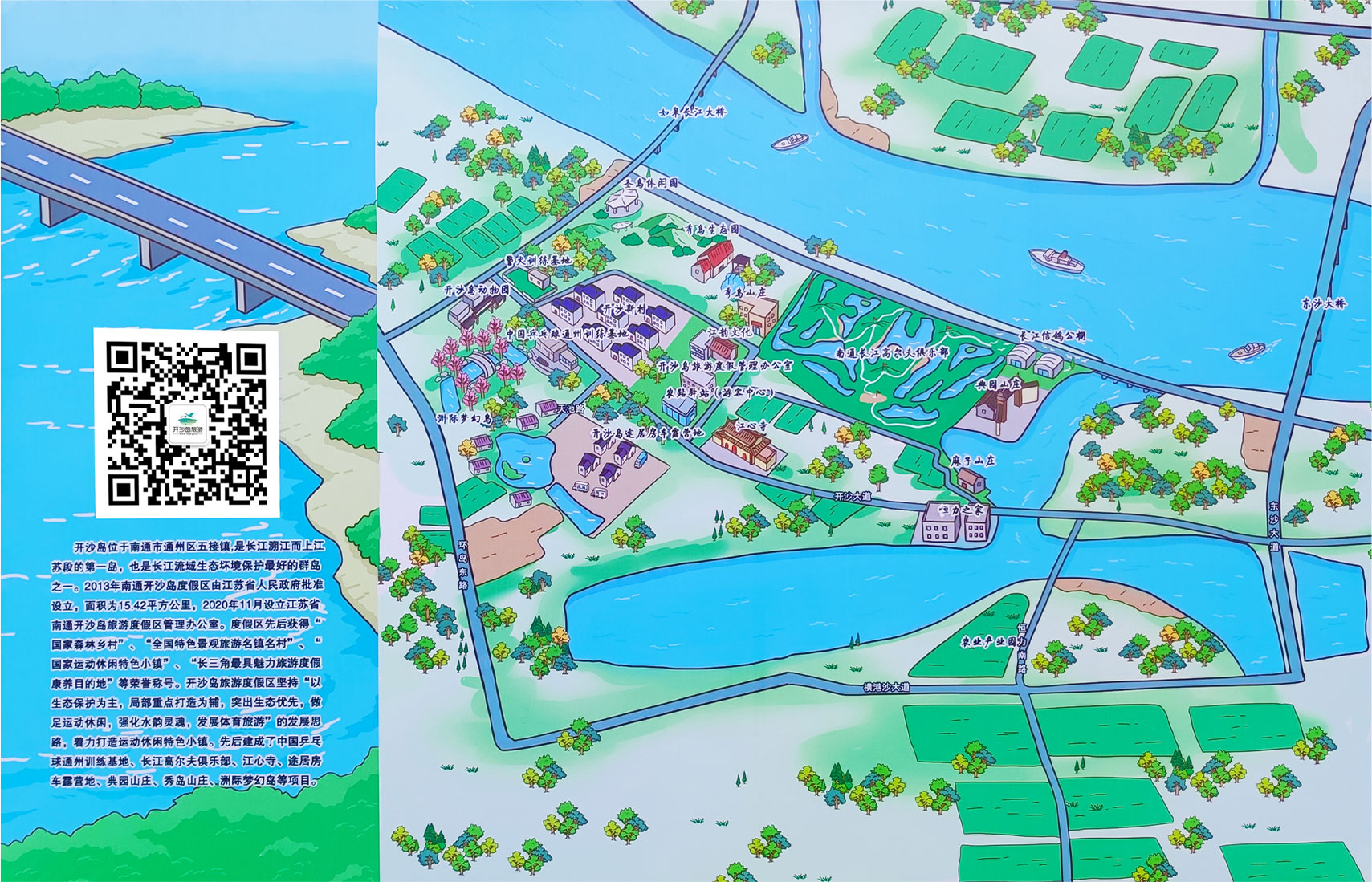 2013年2月1日开沙岛正式获得江苏省政府批准成立江苏省南通开沙岛旅游度假区。度假区规划面积15.42平方公里。以“生态”为基础,以“绿色、健康”为主题,融合岛内文化资源,丰富岛上旅游文化内涵,开发建设了一批以“休闲、垂钓、采摘、运动、美食”为特色的景区,占地2060亩的华能度假村,垂钓长廊、休闲木屋、曲径搭桥、芦苇湿地、百亩桃园、网球场。占地200多亩滩涂围垦兴建的典园山庄,融花木园林、仿古院落、滩涂江景为一体,主体建筑是一座微派风格,曲折迂回的廊檐石径,雕栏玉砌的亭台楼阁,盈盈流淌的水光花影。垂钓、烧烤、餐饮等服务项目让你留连往返。中国乒乓球通州训练基地和乒乓球训练学校集乒乓球运动训练、科研、教学以及对外合作交流为一体,已成为我国乒乓球运动重要的人才培养基地和对外交流窗口。岛上的江心寺是长江入海口溯江而上的第一个江口寺庙,占地40亩,为社会各界佛教信徒捐建,寺内建有大雄宝殿、观音殿、地藏殿、天王殿、藏经楼、钟鼓楼等建筑,设计精巧,别具一格,是一个具有江岛特色的佛教景区。东沙岛周边温地景区为纯自然温地,让人以回归自然的感觉,农家乐景区、秀岛山庄、江心洲生态园、珍稀动物养殖园亦让人留连往返,一个“浮”在长江上的旅游度假区欢迎您的到来。